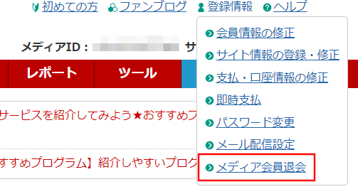 A8ネットにログイン後、画面右上の「登録情報⇒メディア会員退会」をクリック。