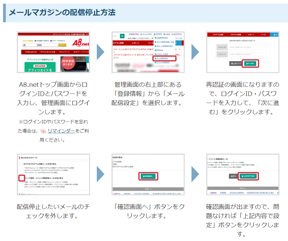 メルマガはA8ネットの設定から配信停止にできるので、メルマガを受信したくない人は設定を変更しておきましょう。