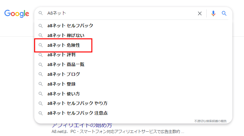 Googleで”A8ネット”と検索すると、予測候補に「危険性」というキーワードが出てきます。