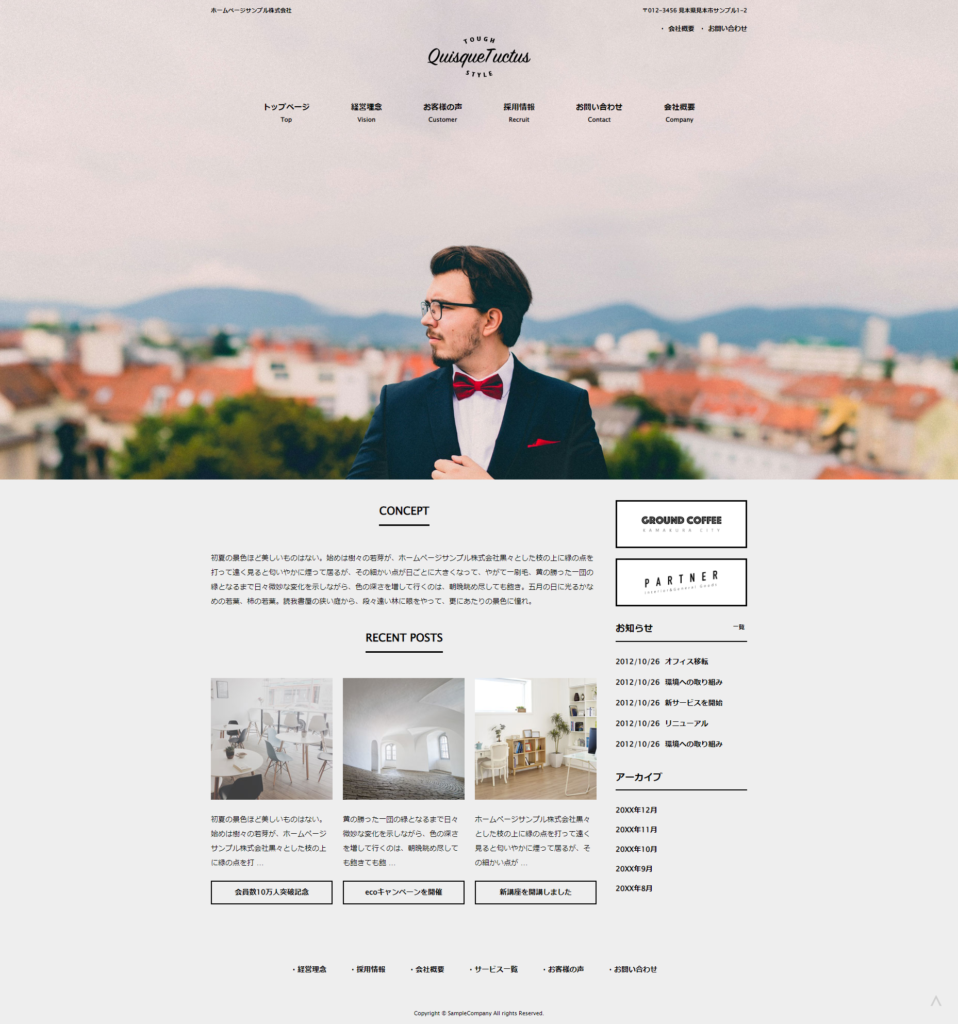 お客様の声や経営理念などのページが最初からサイトに用意されているので、あとは中身の文章を考えておくだけで自社サイトに使用できます。
