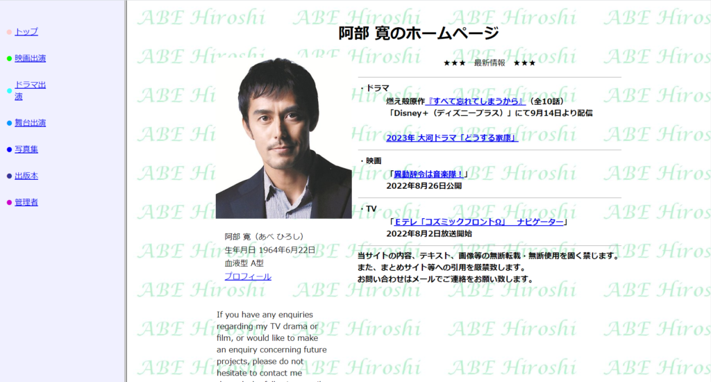それに対して、阿部寛のホームページ。こちらは何がどこにあるのかが一目瞭然です。